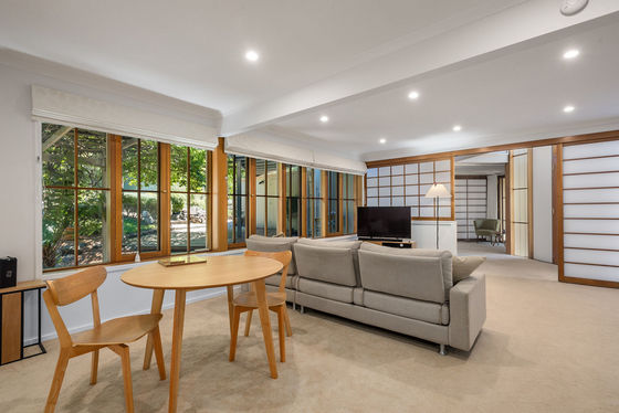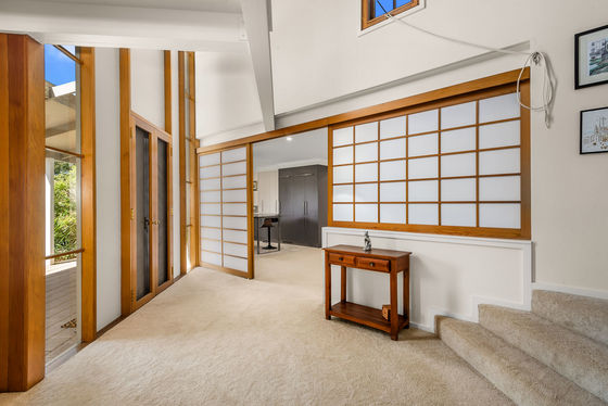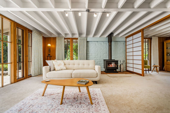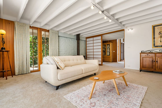 The northern wing reveals a stunning, light-filled living space featuring edgy mud brick walls and a freestanding fireplace"an incredibly versatile room ideal as a sophisticated lounge, home office, or an inviting entertaining zone with double doors wide enough to accommodate a pool table or even a grand piano. Timber screens add a refined architectural touch, subtly defining multiple living areas while maintaining a sense of openness and flow.