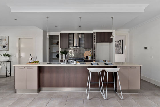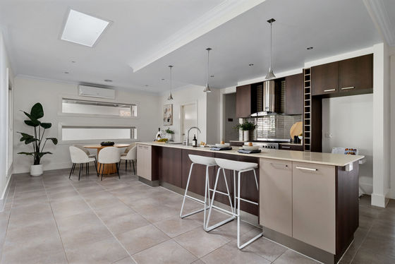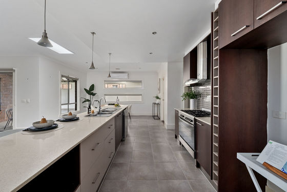 At the centre of the home, the kitchen is both functional and refined, complete with Caesarstone benchtops, a 900mm stainless steel cooker, dishwasher, rangehood, and a spacious walk-in pantry perfectly equipped for those who appreciate both cooking and hosting.