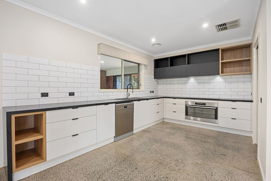 The kitchen includes modern electric appliances, a dishwasher, storage cabinetry and preparation space, and connects to the main living areas. A large light-filled outdoor living area or rumpus room provides an additional internal space.