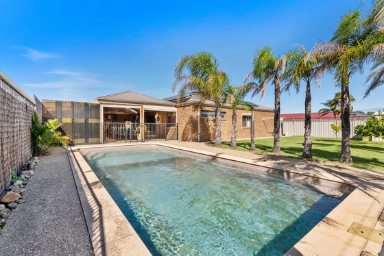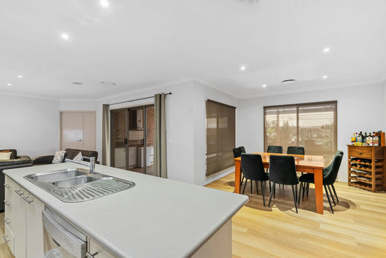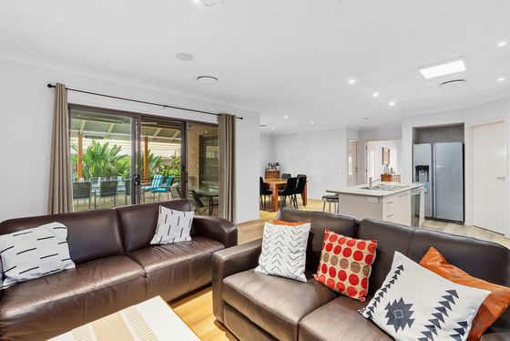 At the heart of the home lies the expansive open-plan living and dining area, which flows seamlessly to the large outdoor entertaining space. This stunning alfresco area overlooks the sparkling swimming pool and lush grassed backyard, creating the ultimate setting for summer barbecues, poolside gatherings, and unforgettable family moments.