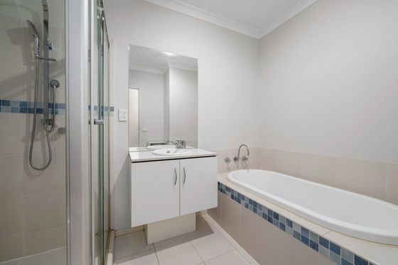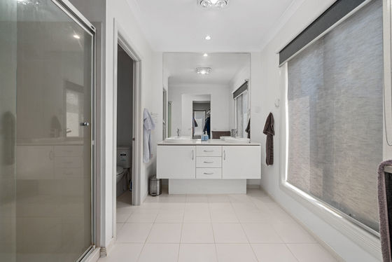 Privately positioned at the rear of the home, the expansive master suite is a true retreat. Showcasing sliding doors with backyard access, double blinds, roller shutters, and a spacious walk-in wardrobe, it is further complemented by a large ensuite featuring a double vanity with stone benchtop and a separate toilet.