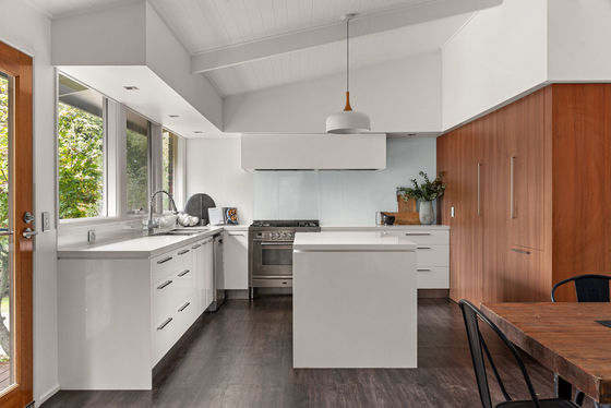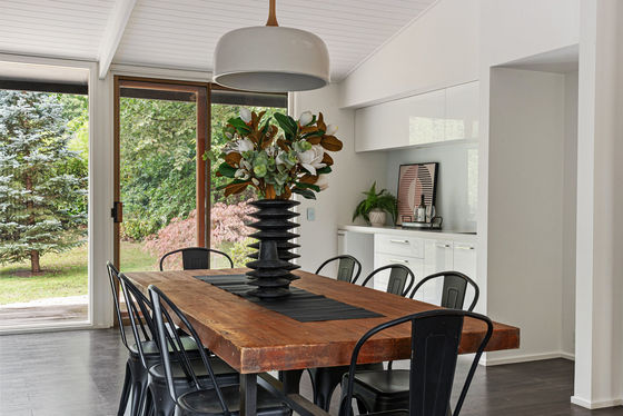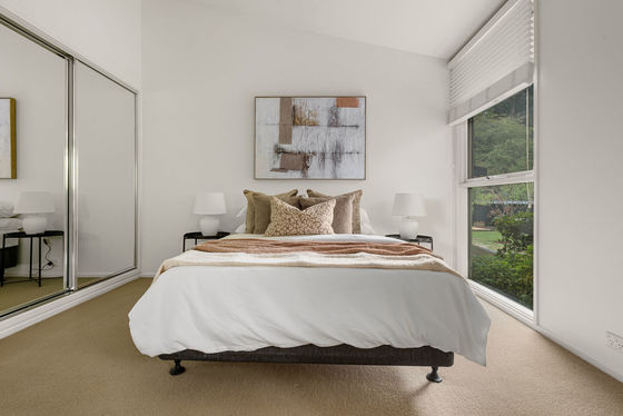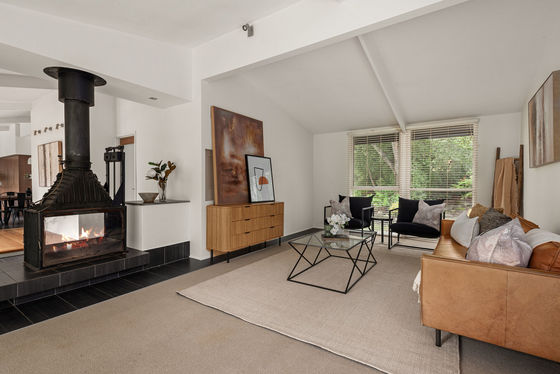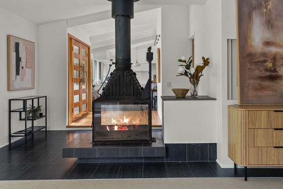 A landscaped front garden and attractive façade create an immediate sense of arrival. Inside, the home is filled with natural light, with an open plan kitchen, meals and living area forming the heart of the home. The kitchen is appointed with stone benchtops, a 900mm oven, integrated Liebherr fridge and Miele dishwasher. The adjoining meals area includes a service bar and sink, while the lounge is centred around a Cheminées Philippe wood fire and enjoys lovely garden outlooks.