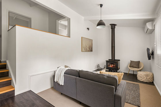 The main bedroom includes mirrored built-in robes and ensuite, while a separate wing of the home provides two further bedrooms with built-in robes. A sunken rumpus offers additional flexibility and includes a pull-out double bed, wood fire heater and private external access. A central bathroom with walk-in shower and split system heating and cooling complete the layout.