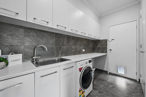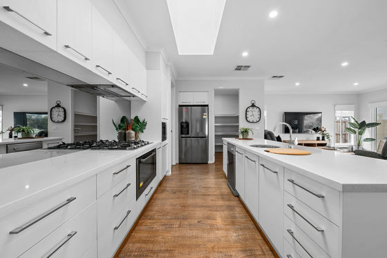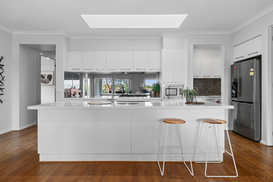 The kitchen is both functional and well-finished, offering expansive stone benchtops, undermount sinks, an in-built microwave, glass splashback and an enormous amount of cabinetry, complemented by a large walk-in pantry, all positioned to overlook the main living and dining area.