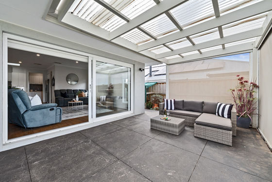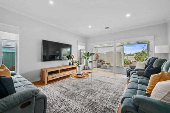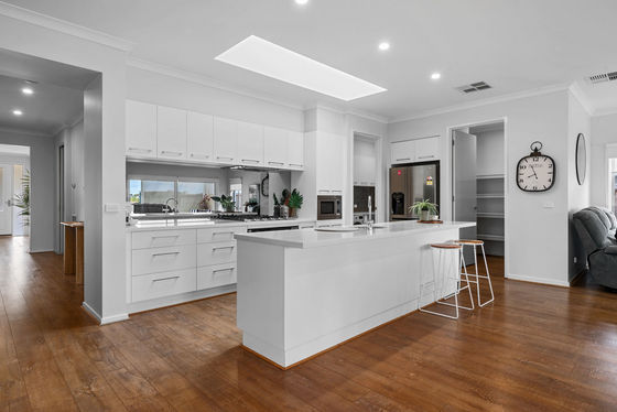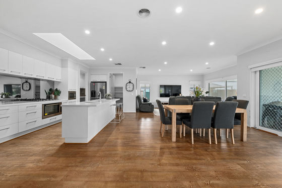 At the heart of the home, the main living zone opens into a spacious open-plan kitchen, dining and family area. A large skylight draws in natural light, enhancing the sense of space and creating a warm, inviting environment throughout the day. Sliding doors from both the main lounge and dining area create a seamless connection through to the backyard.