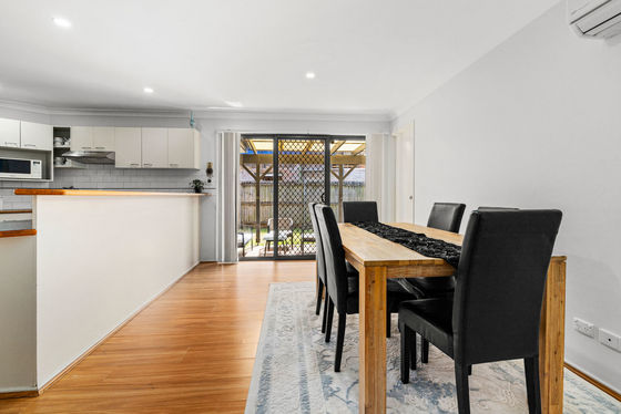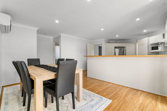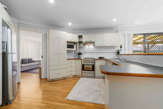 The home features three generous bedrooms, all with built-in wardrobes, and a practical two-way bathroom. A spacious living area is complemented by separate family and dining areas, providing plenty of room for both everyday living and entertaining. The large open kitchen offers ample bench space and storage and sits at the heart of the home.