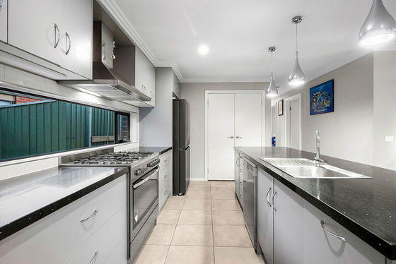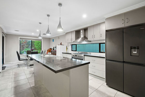 At the heart of the home, the spacious kitchen includes stone benchtops, a central island, five-burner gas cooktop, glass splash back and excellent storage. The adjoining dining area captures views across the reserve, creating a relaxed and light-filled space for family gatherings.