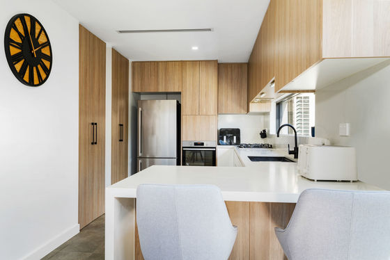 - Modern chefs kitchen with stone benchtops, gas cooking & ample cupboard space