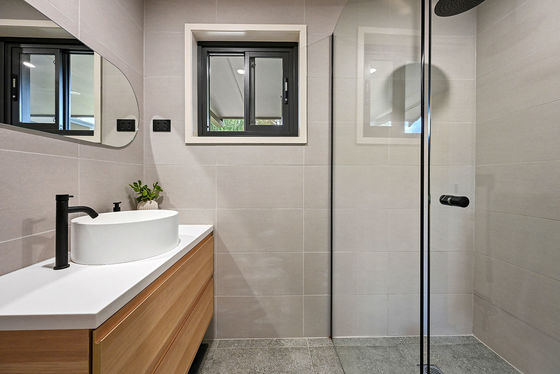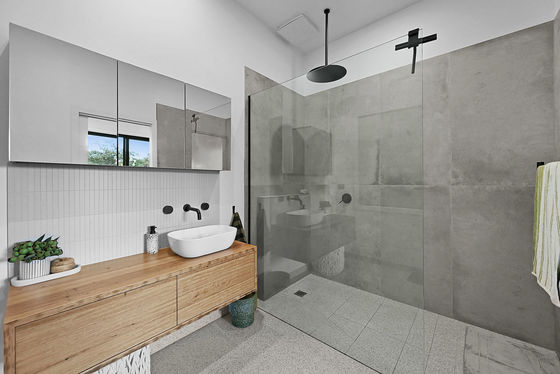 • Family bathroom plus two ensuites with floor-to-ceiling tiles, floating vanities and wide frameless showers.