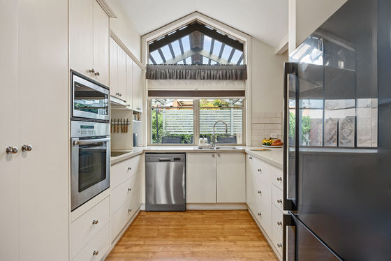 • Light-filled kitchen with high ceiling, dishwasher, wall oven and pantry.