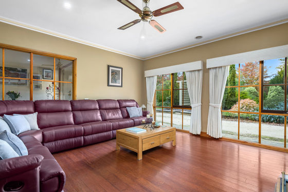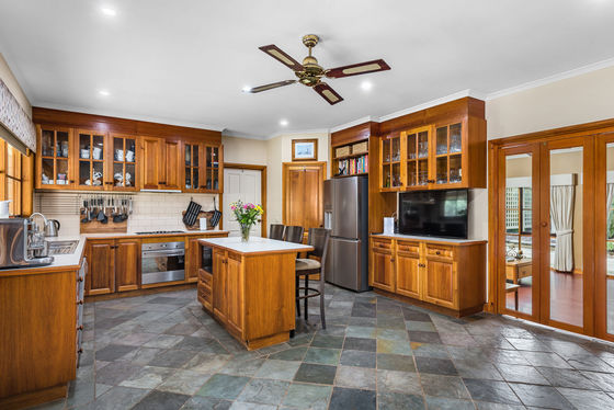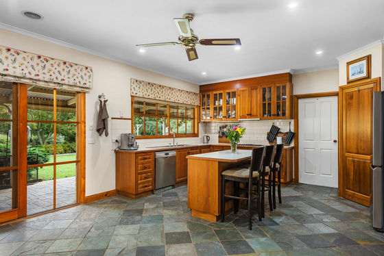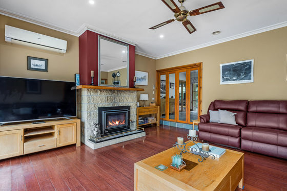 The four-bedroom home, crafted in sandstone-look brick with striking coined corner detailing, is designed for space and versatility. Wide verandahs extend across both the front and rear, offering year-round enjoyment and multiple vantage points across the property. Inside, the heart of the home is a generous country kitchen, thoughtfully appointed with a 900mm cooktop, 600mm stainless steel oven, dishwasher, walk-in pantry with water point, central island bench, and a built-in kitchen hutch that enhances both storage and character. The adjoining dining zone flows into a formal sunken lounge complete with a Coonara wood fire, creating a warm and inviting space, while a separate family/rumpus room with built-in bookcases provides flexibility for those working from home or accommodating a growing family.