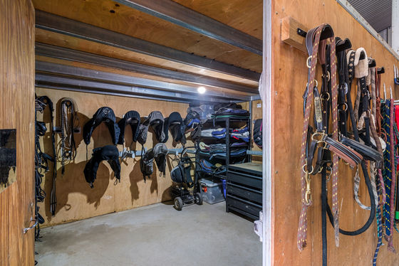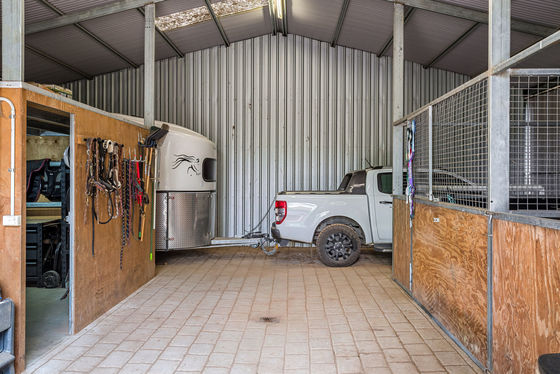 Supporting infrastructure includes a large stable and machinery shed with paved external tie-up points, an internal service area, hot wash bay, and a secure tack room where everything is well organised. Above, a mezzanine level provides additional storage. This complex also incorporates two lined stables and space for a float and tow vehicle. A separate machinery shed and workshop caters for hay storage, tractors, and equipment, ensuring the property is fully equipped for serious equestrian use.