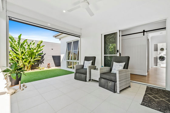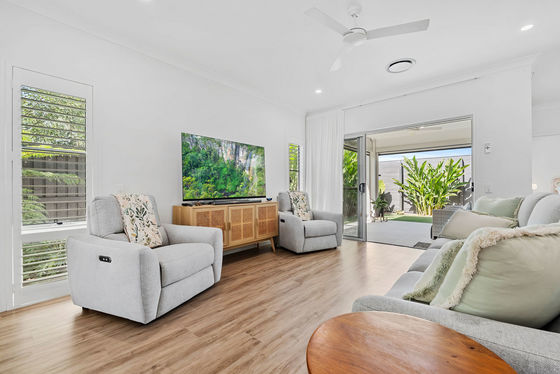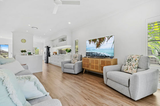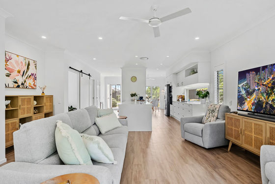 Light filled open plan living and dining areas extend through expansive stacker doors to a large tiled alfresco terrace, creating a private outdoor haven framed by established, easy care gardens. Perfect for entertaining or simply unwinding, this inviting space enhances the home's relaxed coastal feel.