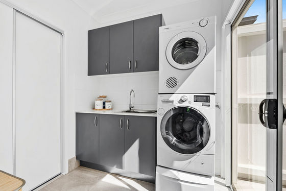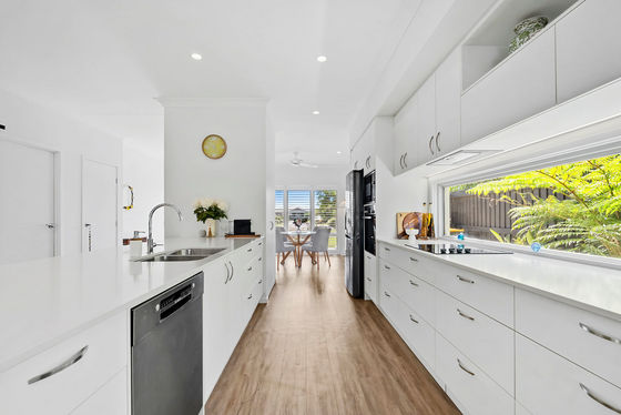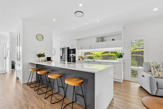 At the centre of the home, the sleek galley kitchen is both stylish and practical, featuring stone benchtops, soft winter white cabinetry, premium appliances and a generous island bench. Thoughtfully designed, it anchors the living zones while remaining ideal for everyday living and hosting.