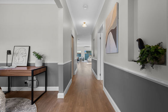 Continuing down the hallway, the well-appointed laundry offers practicality and convenience, with internal access to the garage positioned to service the home with ease.