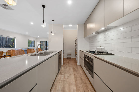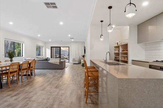 Moving through the home, the floorplan opens into a central hub that is both expansive and highly functional. The kitchen sits at the heart of the design, anchored by quality finishes and a well-considered layout, including a walk-in pantry that comfortably accommodates additional storage and larger appliances. It connects seamlessly to the main living and meals area, a space of impressive proportions (over 10 metres in length), designed to bring people together while still allowing for defined living and dining zones.
