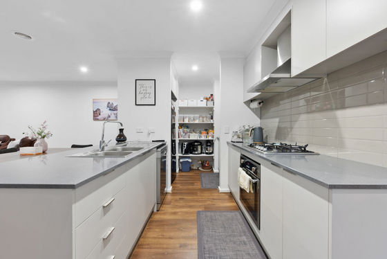 At the heart of the home lies a stunning, well-appointed kitchen showcasing sleek stone benchtops, a gas cooktop, dishwasher, and a walk-in pantry"perfect for those who love to cook and entertain. This space seamlessly overlooks the expansive open-plan meals and living area, creating a warm and inviting atmosphere for everyday living.