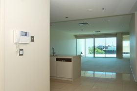 ~ Modern apartment features carpet and tiles.