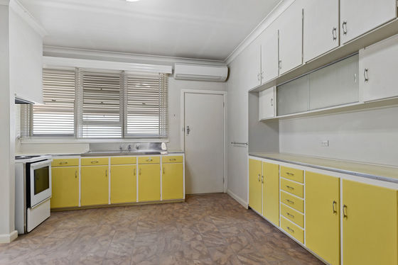 The kitchen includes an upright cooker and storage cabinetry and is serviced by a split-system unit. The home also includes a gas heater for climate control. A central three-piece bathroom includes a shower, bath and vanity, with a large separate laundry located nearby.