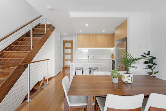 The first floor features a spacious open-plan living and dining area that flows seamlessly onto a large deck overlooking the water, perfect for entertaining. The modern, clean-cut kitchen is a chef’s dream, complete with quality stone benchtops, an island bench, stainless steel appliances, and an integrated dishwasher.