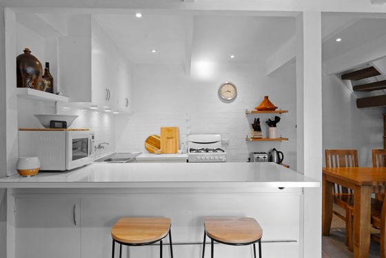 The period kitchen with breakfast bench flows effortlessly into the open plan living and dining area, where afternoon sun floods through every window, complementing the perfectly sized furnishings throughout.