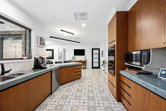 The kitchen is well-appointed with electric cooking, dishwasher, walk-in pantry, and ample cabinetry and bench space.