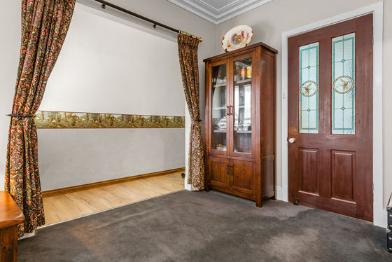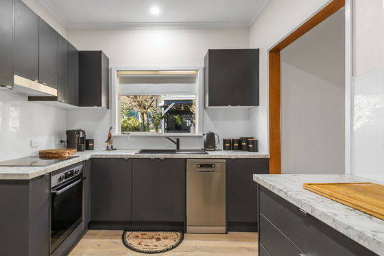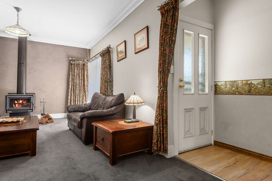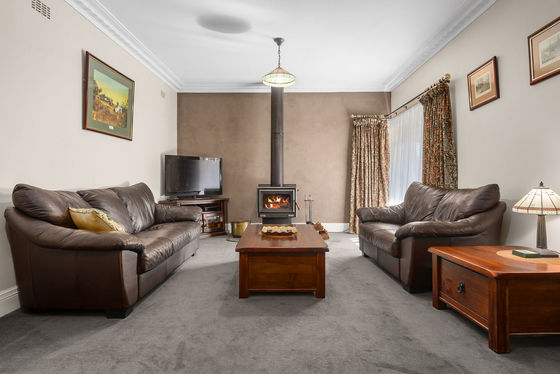 Inside, the warmth of country charm blends with modern updates. The recently renovated kitchen opens to generous living spaces, including a large lounge with a freestanding wood heater, ornate cornicing, and a second family/dining room with split-system heating and cooling. The main bedroom is spacious and filled with northern light, while a third bedroom offers flexibility for family or guests. A bathroom with a beautiful leadlight feature adds character and charm.