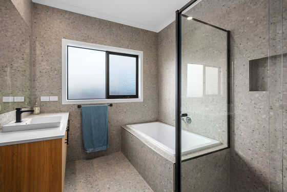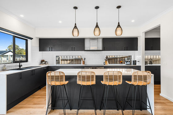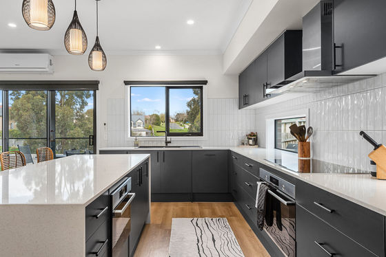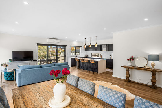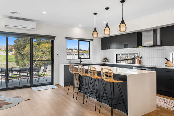 The open-plan kitchen, dining, and lounge area is the heart of the home, featuring sliding doors that seamlessly connect the indoors with the outdoors and provide ample natural light throughout the space, further enhanced by double-glazed windows.
