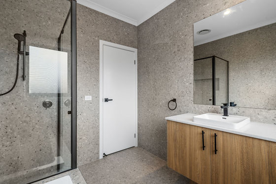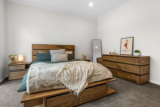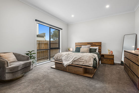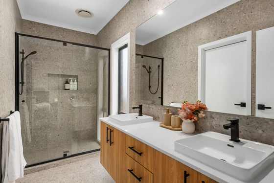 Downstairs, the master suite is a true sanctuary with a spacious walk-in robe and a deluxe ensuite boasting dual vanities and elegant floor-to-ceiling tiling.