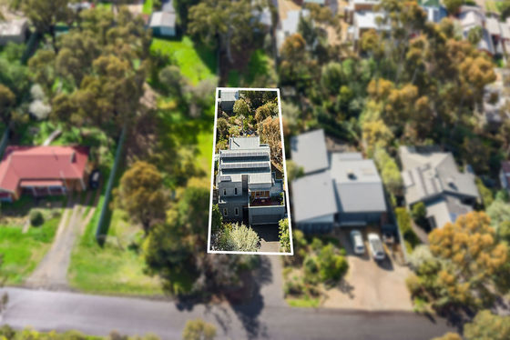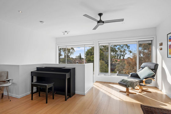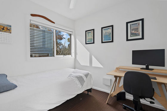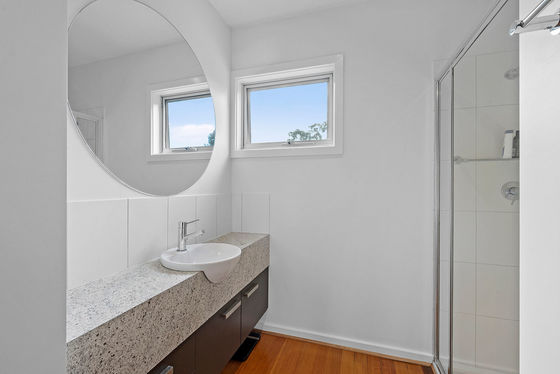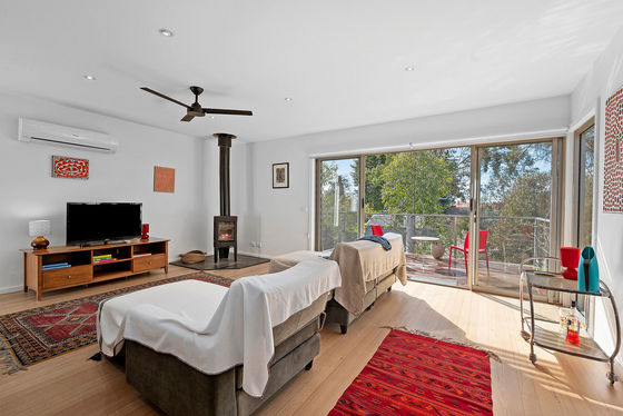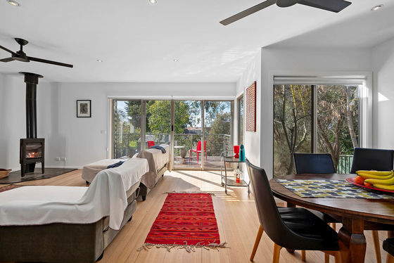 The top floor features the main bedroom, with split system, large walk-in robe and an ensuite with a wide shower and separate toilet. The second open-plan living area takes out the rest of the space, with yet more beautiful views from extensive glazing on either side. Double glass doors open to a front balcony with amazing views to the One Tree Hill and Mount Alexander.