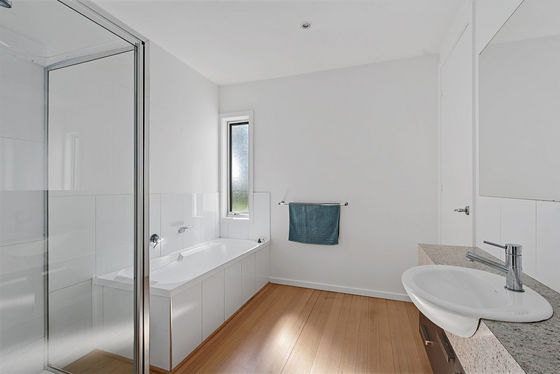 The dining and lounge areas are defined by pale polished timber floorboards, set square cornice, downlights and black feature ceiling fans. A contemporary wood heater will set the scene in the cooler months, while a split system equals easy heating and cooling.