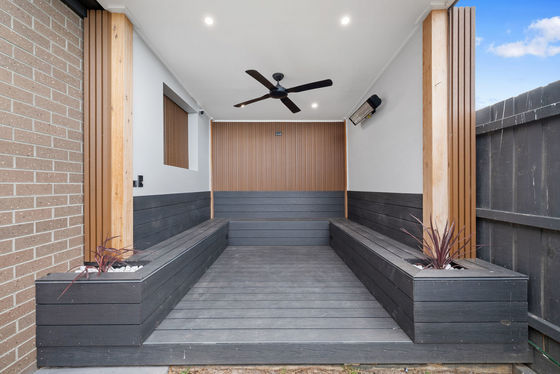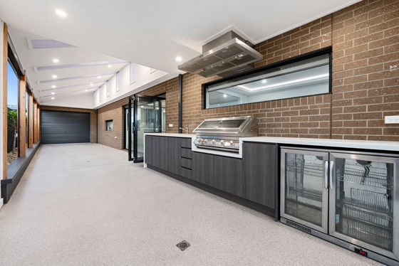 The massive aluminium bi-folding doors lead you outside to your huge pergola! The e-proxy coated concrete stretches the whole way along from the drive through access providing further accommodation for additional cars or trailers. While the raked ceiling let's in natural light through massive skylights, but the weather conditions are controlled through remote controlled bistro blinds, allowing you to enclose the whole space. The built in BBQ and rangehood sits atop the cabinetry featuring a further bench space and fridge cavity, making those summers BBQs even easier! Outside is further complimented by a grassed area and gazebo which has built-in seating and floor which is all crafted from eco deck, with a ceiling fan and heater to battle any element.