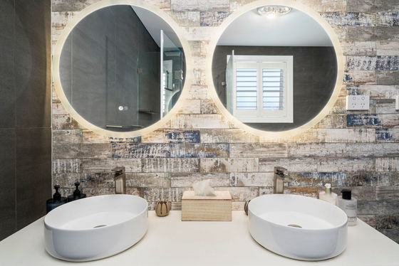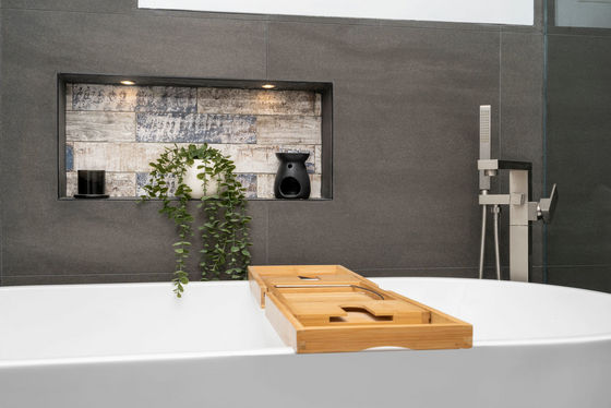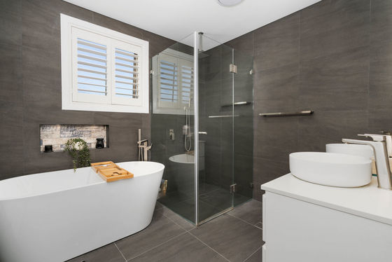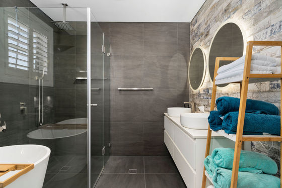 - Luxurious renovated bathroom tiled floor to ceiling with freestanding bath