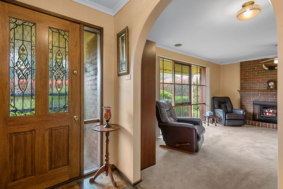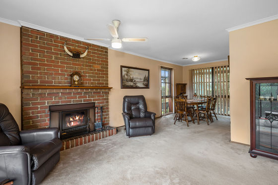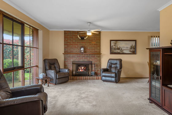 Inside, a neat and tidy kitchen with gas cooking appliances, pantry and adjoins the dining area, flowing easily to the outdoor entertainment space. The welcoming family room at the front of the home overlooks the gardens and is warmed by ducted heating and a cosy wood fireplace, perfect for gathering with loved ones. Accommodation includes a master bedroom with walk-in robe and ensuite, plus two additional bedrooms with built-in robes, serviced by the central family bathroom.
