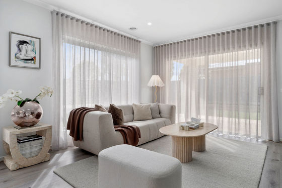 Inside, soaring 9-foot ceilings and a thoughtfully designed floorplan enhance the home's spacious feel. Every element has been carefully considered, from the elegant sheer blinds and upgraded finishes to the stylish stone benchtops and lush gardens at both the front and rear.