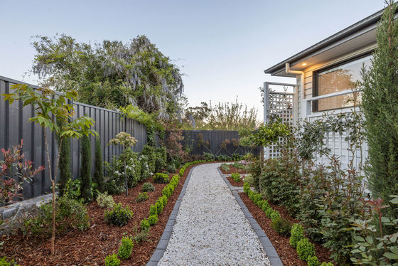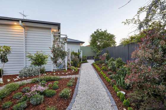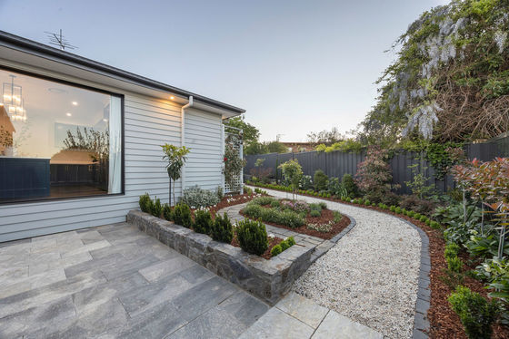 * Manicured gardens with stone pavers