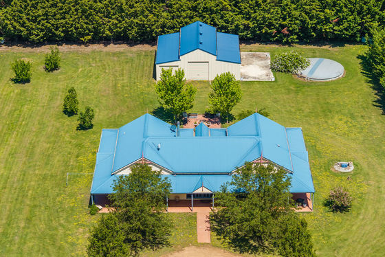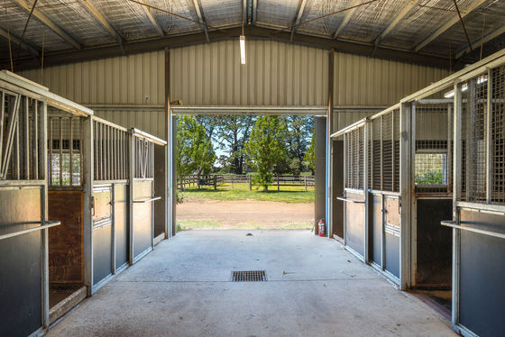 There is also an American Style barn (10.5 x 12m) with two roller doors. On the side there are 6 doors and a concrete pad (10.5x5m). This was originally designed for dog pens. The house block is watered via a very large semi-buried concrete water tank which holds approx. 100,000 litres of water.