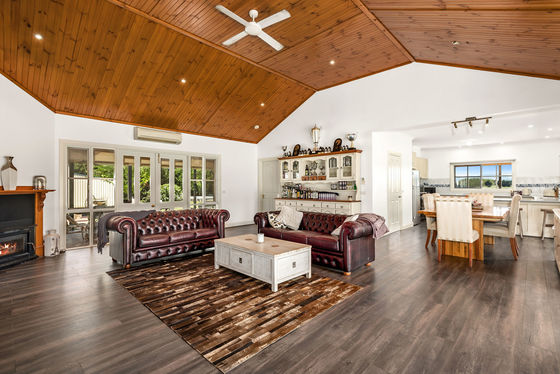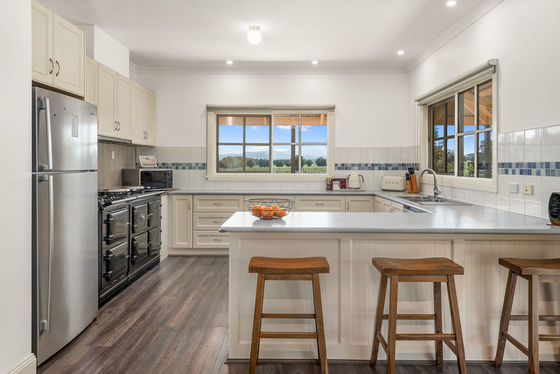 At the heart of the home, an open-plan living and dining area under a timber-lined vaulted ceiling creates a warm and inviting atmosphere, complemented by a combustion wood heater, zoned floor heating, and split-system climate control. The well-appointed kitchen includes a walk-in pantry and AGA oven with module and features both gas and electric cooktops, while wide windows frame tranquil garden views.