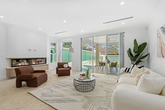. Fireplace feature anchoring the open-plan lounge and dining area with warmth