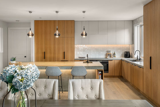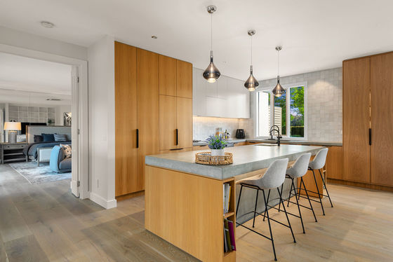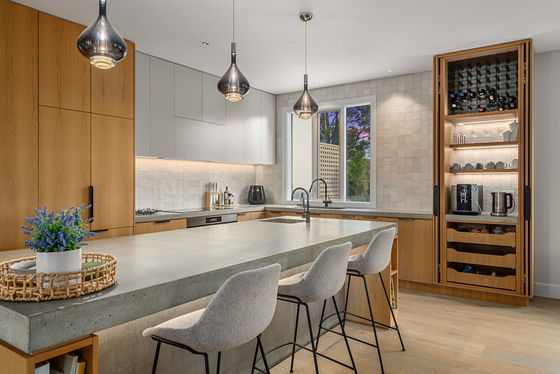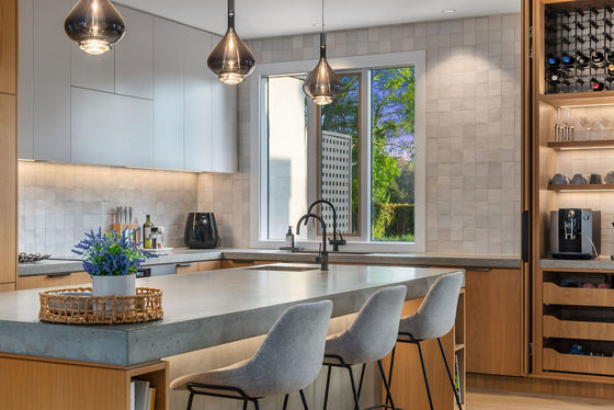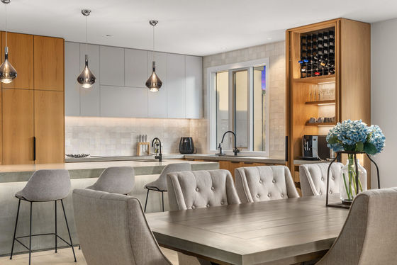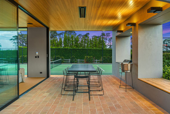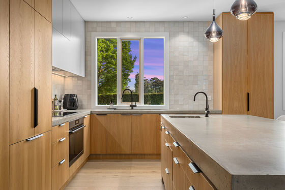 • A large kitchen finished with concrete benches, integrated appliances, coffee station, and adjoining dining space that connects to a fully enclosable outdoor terrace