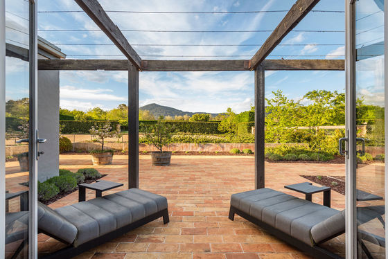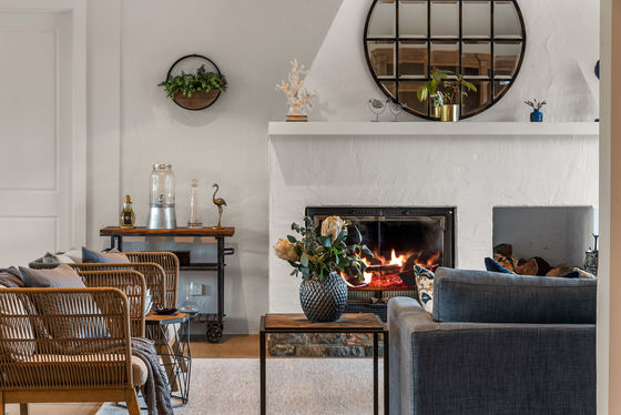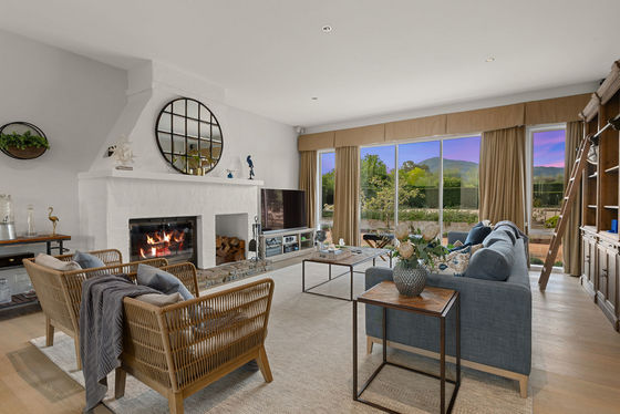 • Lounge with Philippe Cheminees wood fireplace and views north to the mountain, south to the garden terrace
