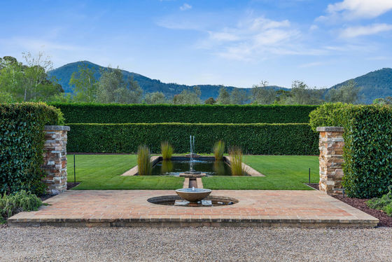 The gardens frame the house with structure and detail, clipped hedges, fountain, sculpture and pond, terracotta paving, and a raised-bed vegetable garden and apple orchard.