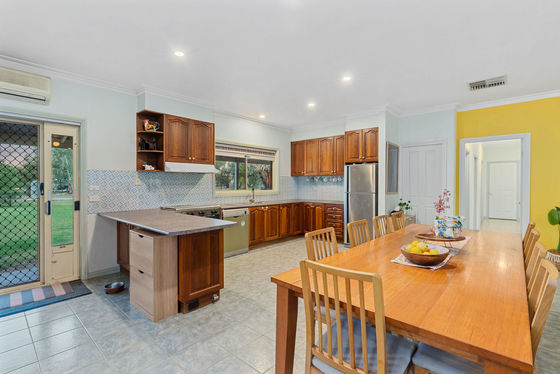 The well-designed open-plan kitchen, living, and dining area forms the central hub of the home. The kitchen includes a gas cooktop, gas oven, dishwasher, and a generous walk-in pantry, making daily living effortless. The adjoining dining space is enhanced by a large Coonara wood heater, providing warmth and ambience throughout winter. Beyond this, an expansive second living area offers an excellent retreat for relaxation, entertainment, or family gatherings.
