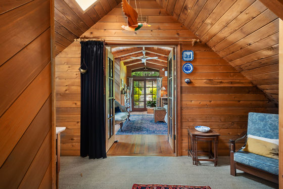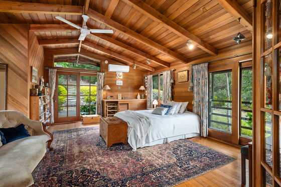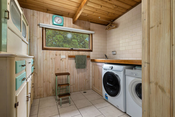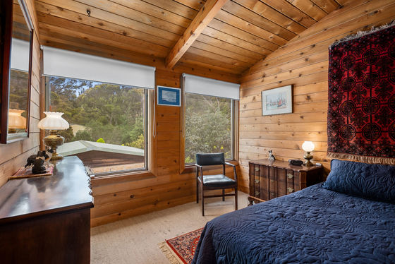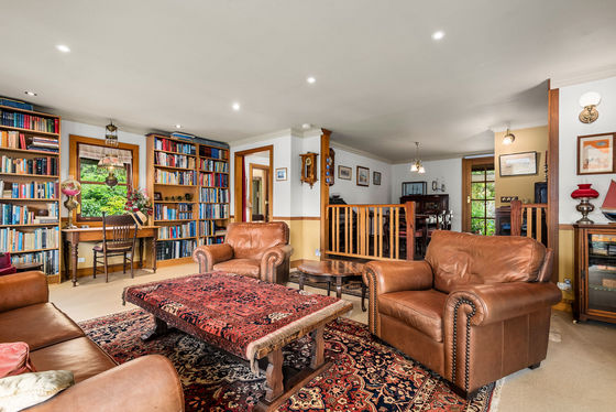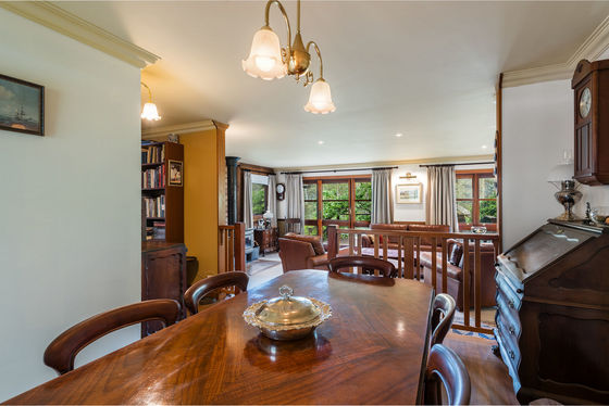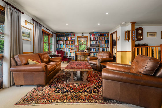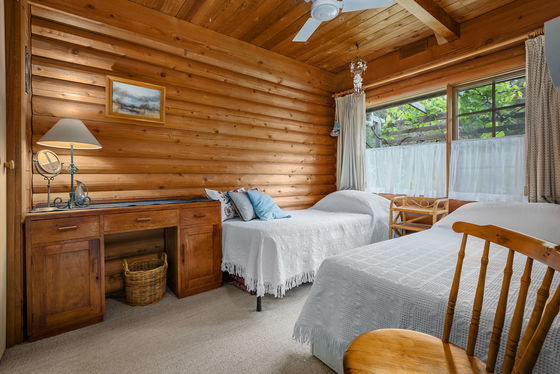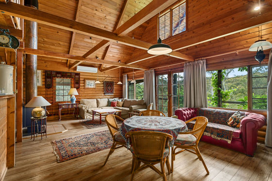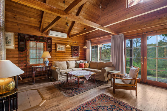 The home itself is a warm and welcoming log cabin, built by True Craft Homes in 1971 using Western Red Cedar imported from Canada. Full of charm and exceptionally well insulated, it offers comfortable family living with a unique character rarely found today. The ground floor opens into a formal lounge with a fireplace, leading to a study or dining room. Two wood combustion heaters and two split systems ensure year-round comfort. The kitchen is well appointed with a St. George oven, Miele dishwasher, double sink and generous pantry. Two bedrooms with built-in robes, an original-condition family bathroom, and a renovated laundry complete the lower level, along with an integrated two-car garage and a huge games or multi-purpose room.