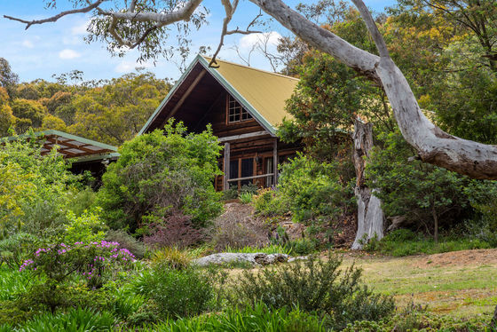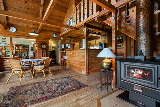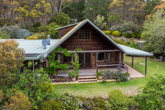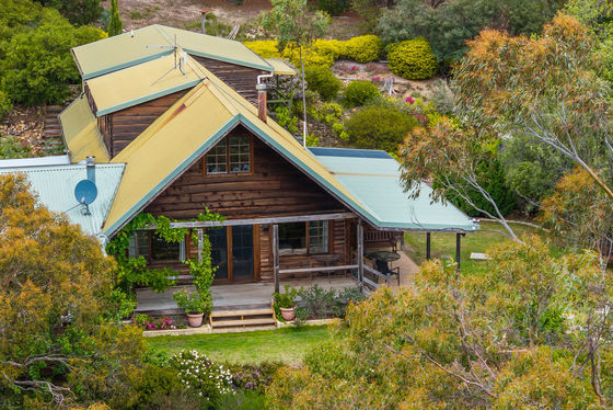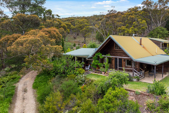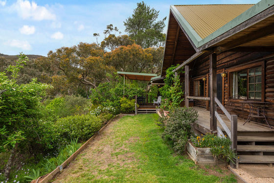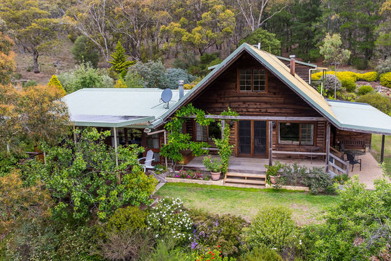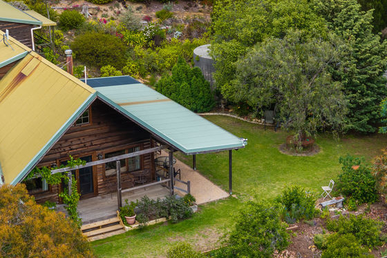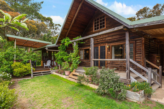 Additional features include powered gates at front entrance, a septic tank system, concrete water tanks, an undercover outdoor entertaining area, and the enduring charm and insulation benefits of a solid log cabin construction without treatment chemicals.