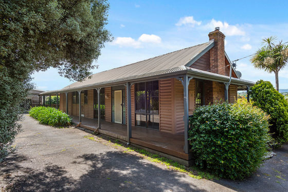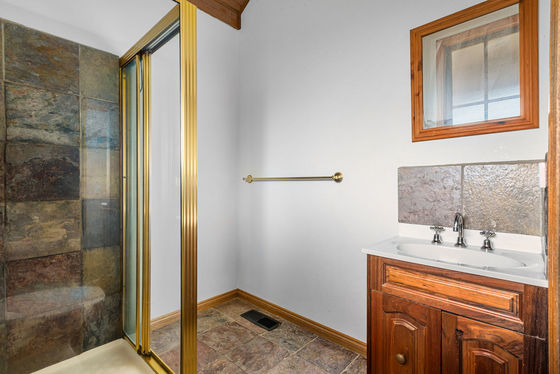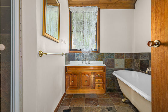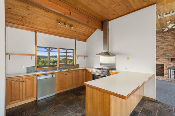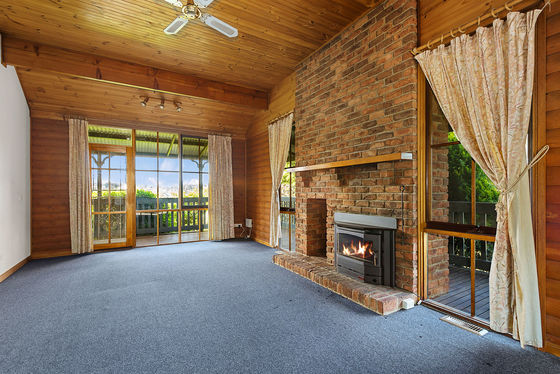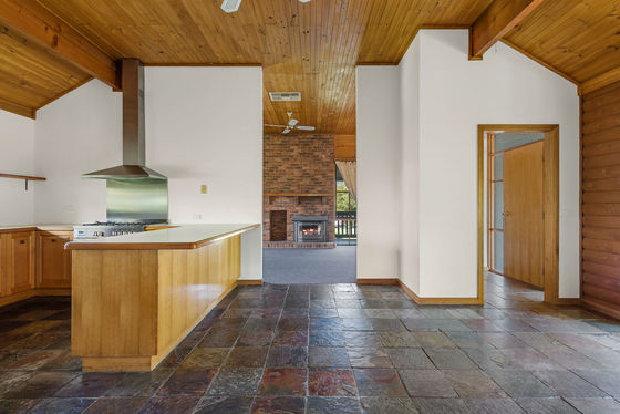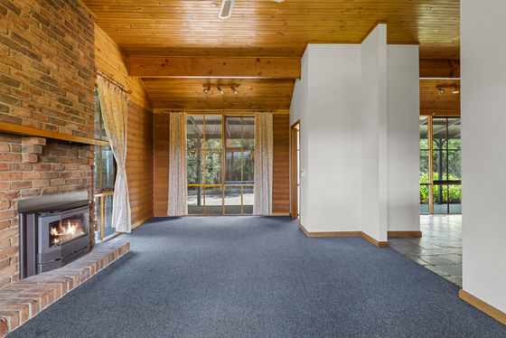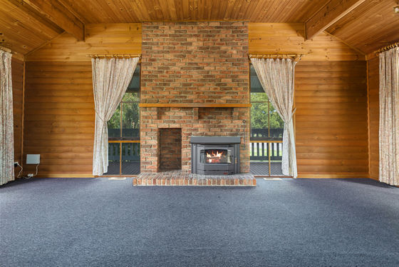 Step inside through the welcoming entry foyer and into a warm, inviting lounge featuring vaulted ceilings, timber beams and a floor-to-ceiling brick fireplace-the perfect centrepiece for cosy nights in.
