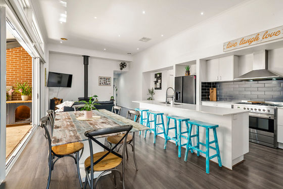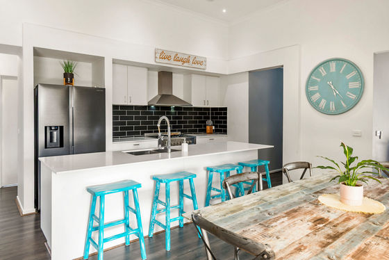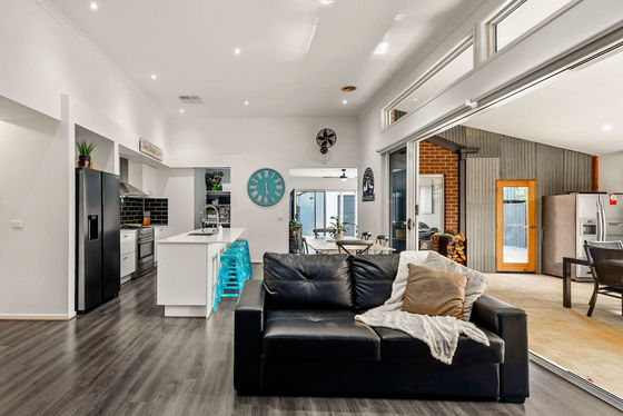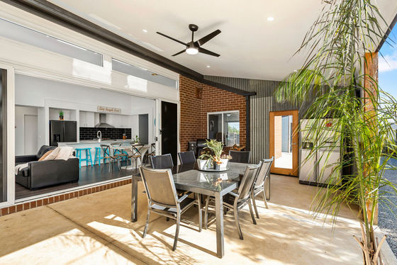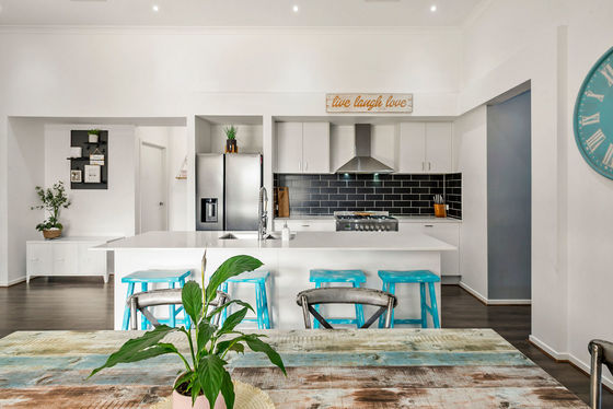 The heart of the home is defined by extra-high ceilings and a centrally located kitchen seamlessly connected to the dining and living spaces. Large sliding doors open right up to a substantial 5.5m x 8m pergola, creating a true indoor-outdoor lifestyle zone ideal for entertaining year-round.