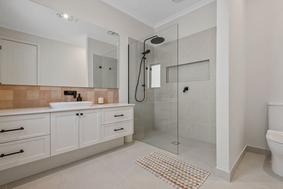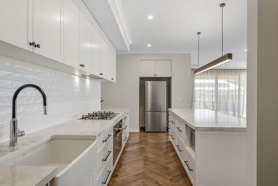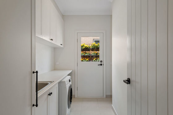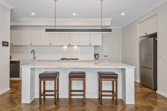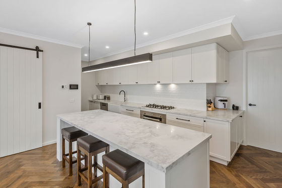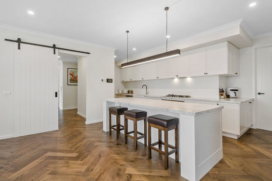 At the heart of the home lies a chef's kitchen that will impress even the most discerning buyer. Showcasing a striking feature island, 40mm Stone Ambassador benchtops, butler's sink, 900mm Ilve gas cooktop and oven, Bosch dishwasher, and a walk-in pantry, this space is as functional as it is beautiful. The subway tile splash back and soft-close shaker cabinetry complete the picture of timeless elegance.