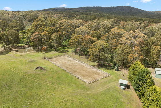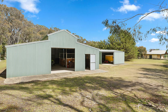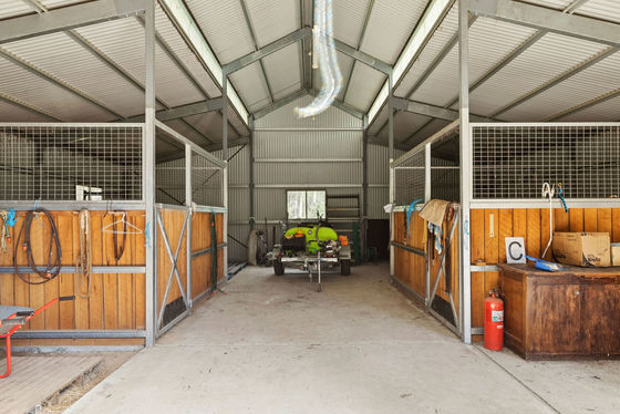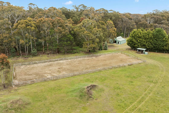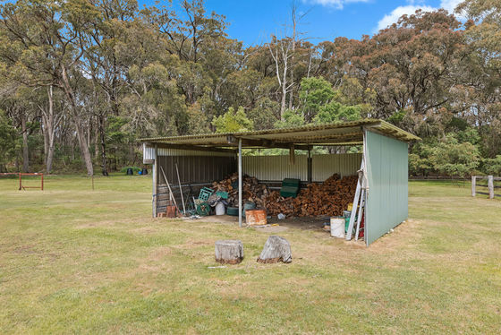 - 2 main sheds with concrete floor, power and 22,000 litres approx. water tanks, woodshed, with mezzanine, 2 horse / animal shelters and horse menage.