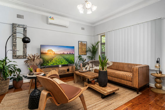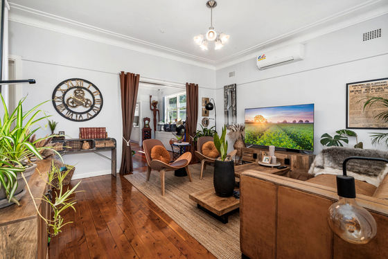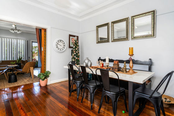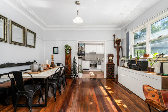 Bright and open lounge room flowing into the dining area with timber flooring